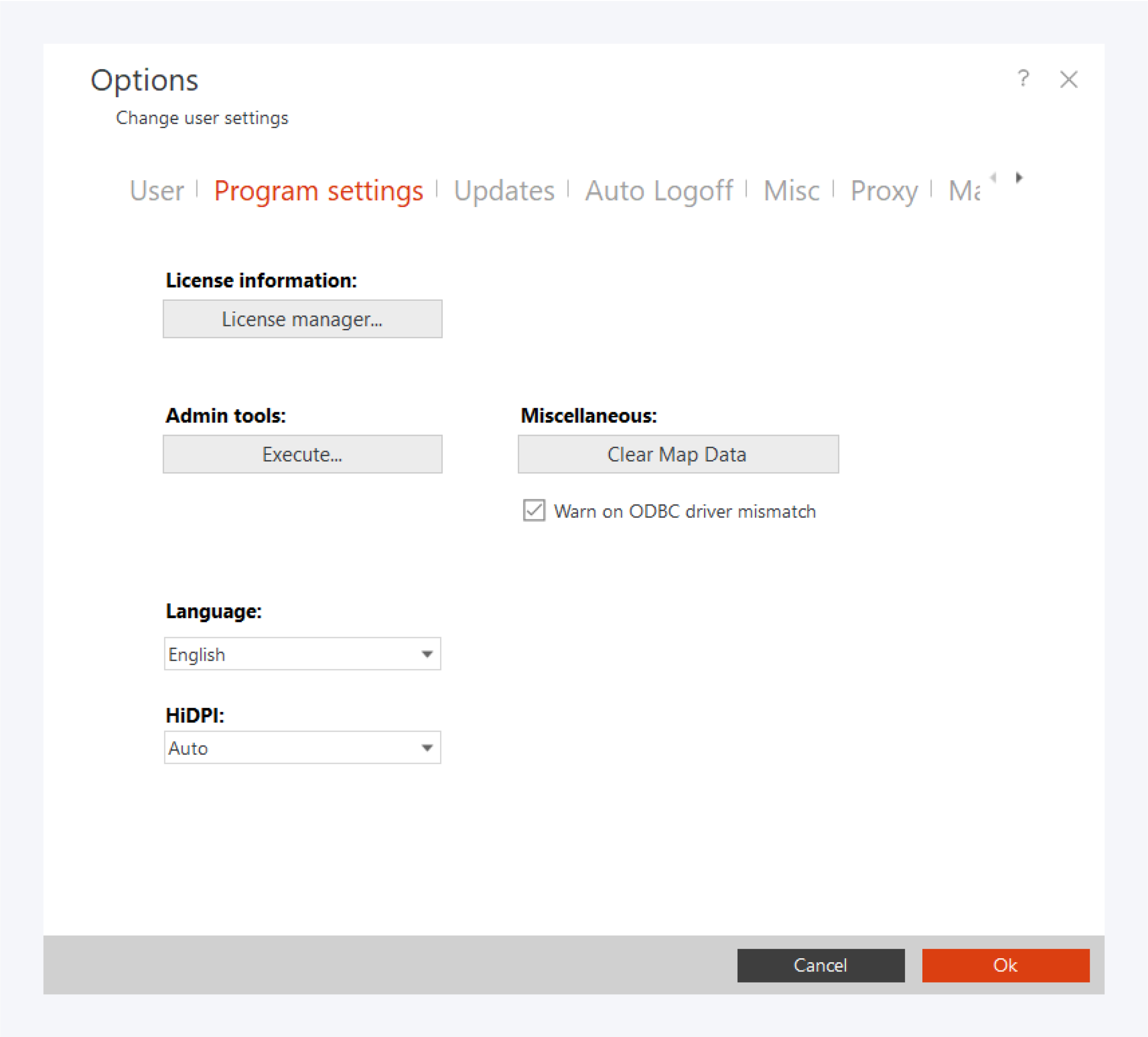 License information, Admin tools, Miscellaneous, a check box you can to warn on Open Database Connectivity driver mismatch, Language options, and display options.