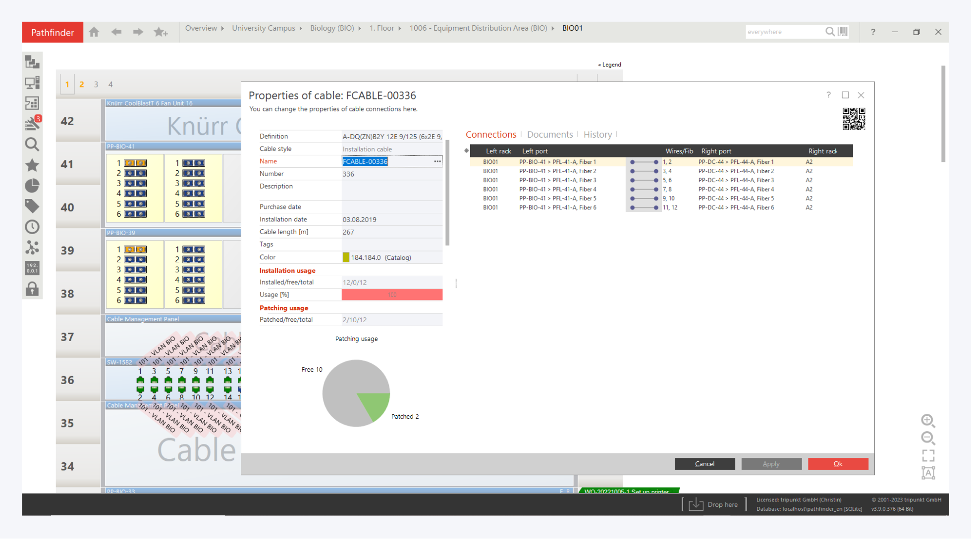 Also, you can open the properties of a primary cable, in this example FCABLE-00336, and enter the cable length. Use the Connections tab at wire/fiber level to determine whether these are connected, configured with a line type or free.