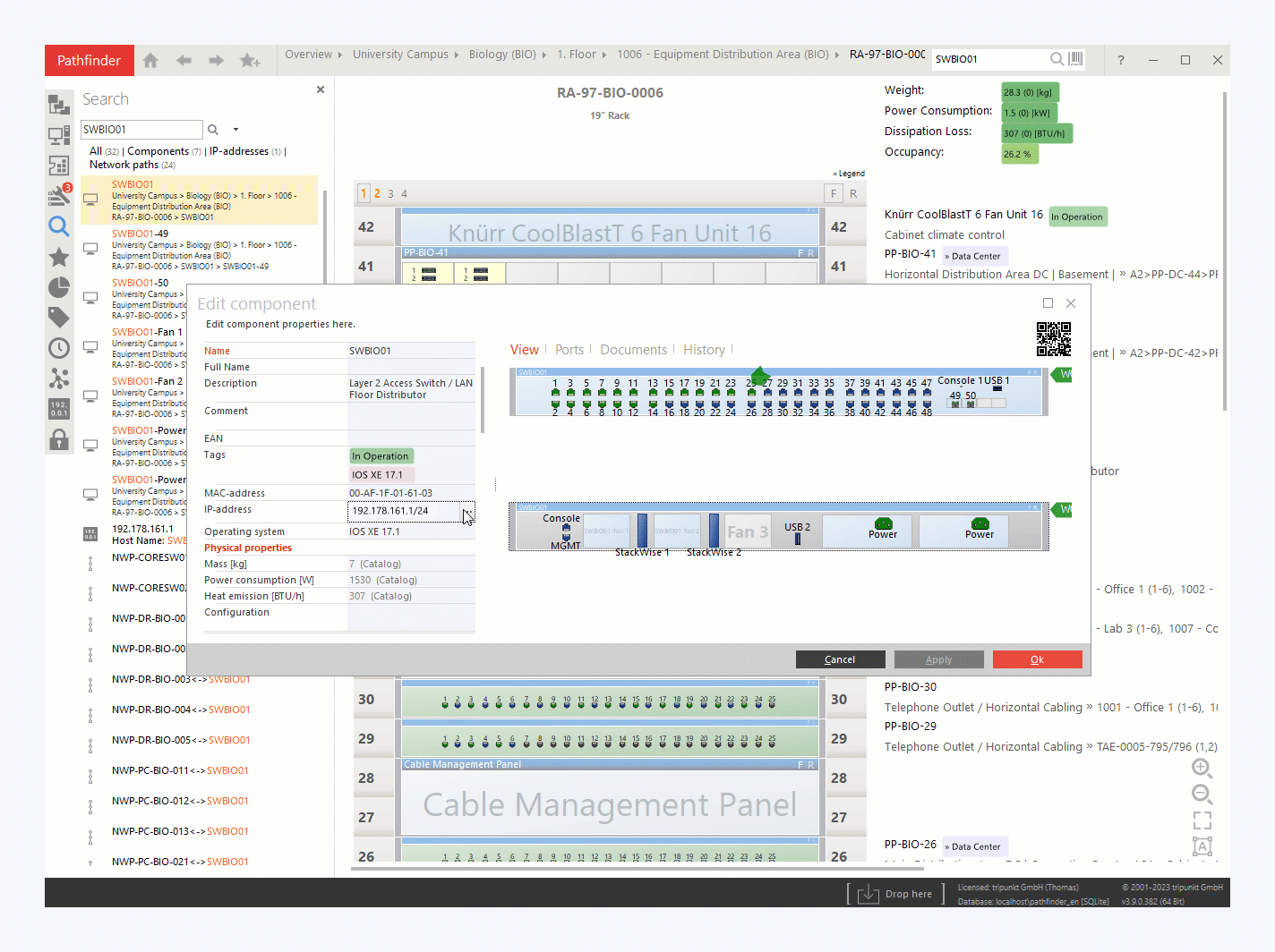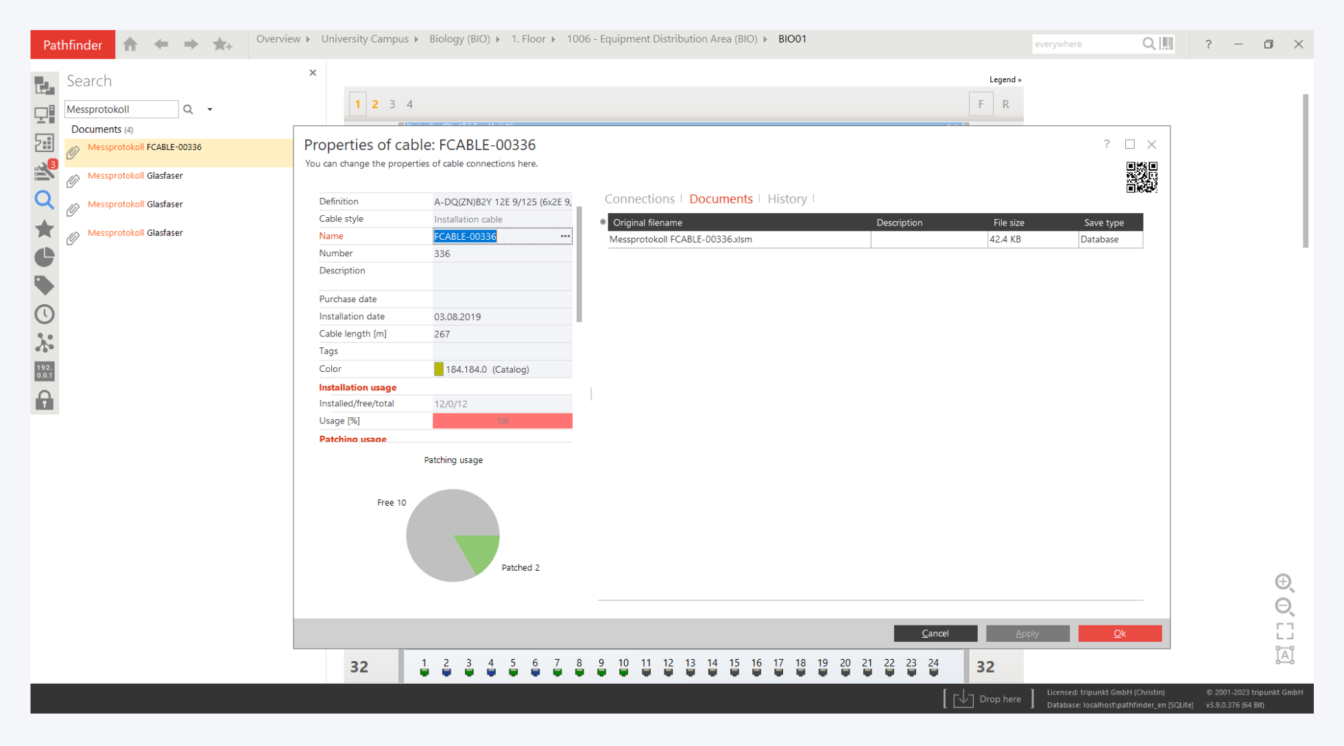 Pathfinder offers the possibility to store, display or edit additional information for all IT assets and cables. You can store these additional properties on any object in the database, such as a tray or a location, and also have them displayed in reporting.