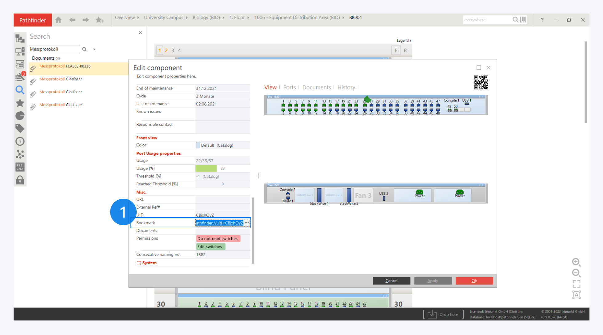 Just try it out. Use the search in the sidebar or click on the switch SWBIO01 and open the properties dialog via the context menu. For example, assign an IP address or enter a serial number.