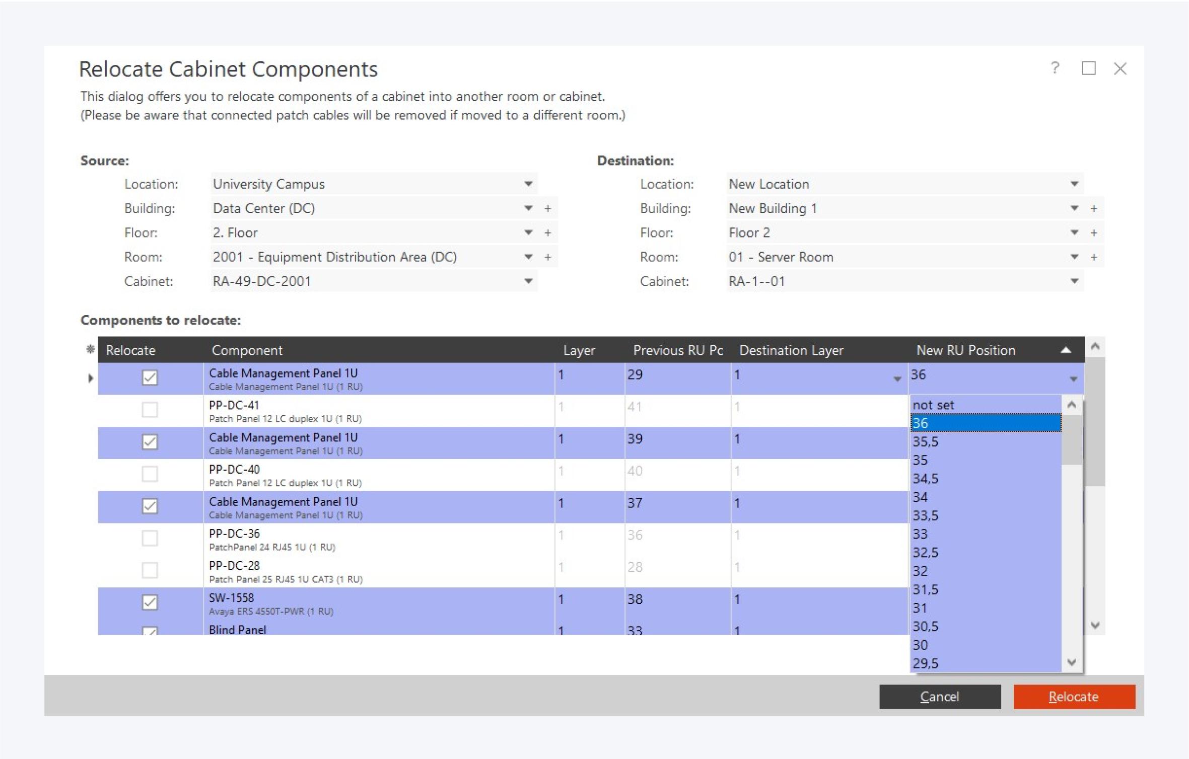 Choose the new layer and RU position in the destination cabinet you want to relocate the component to.