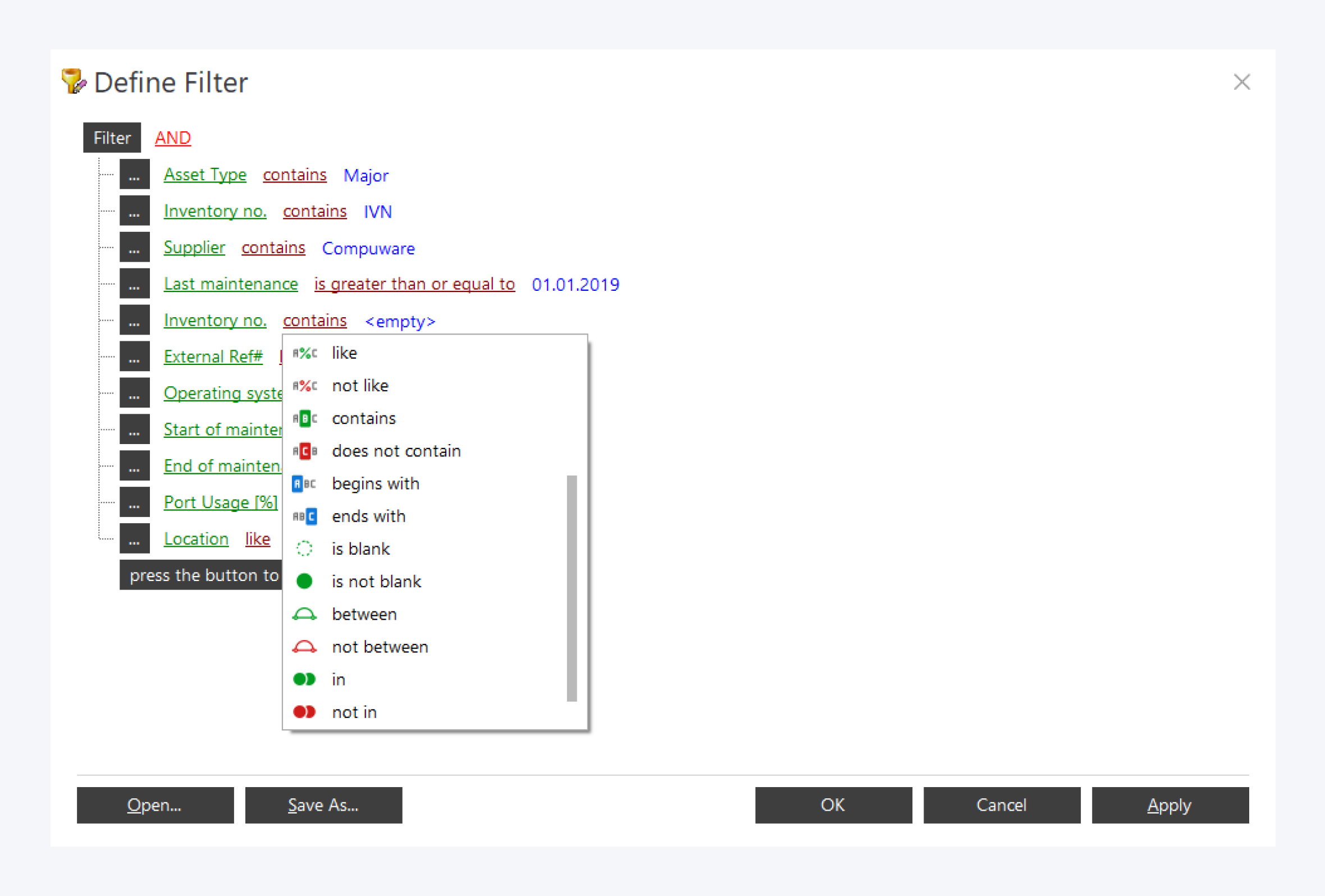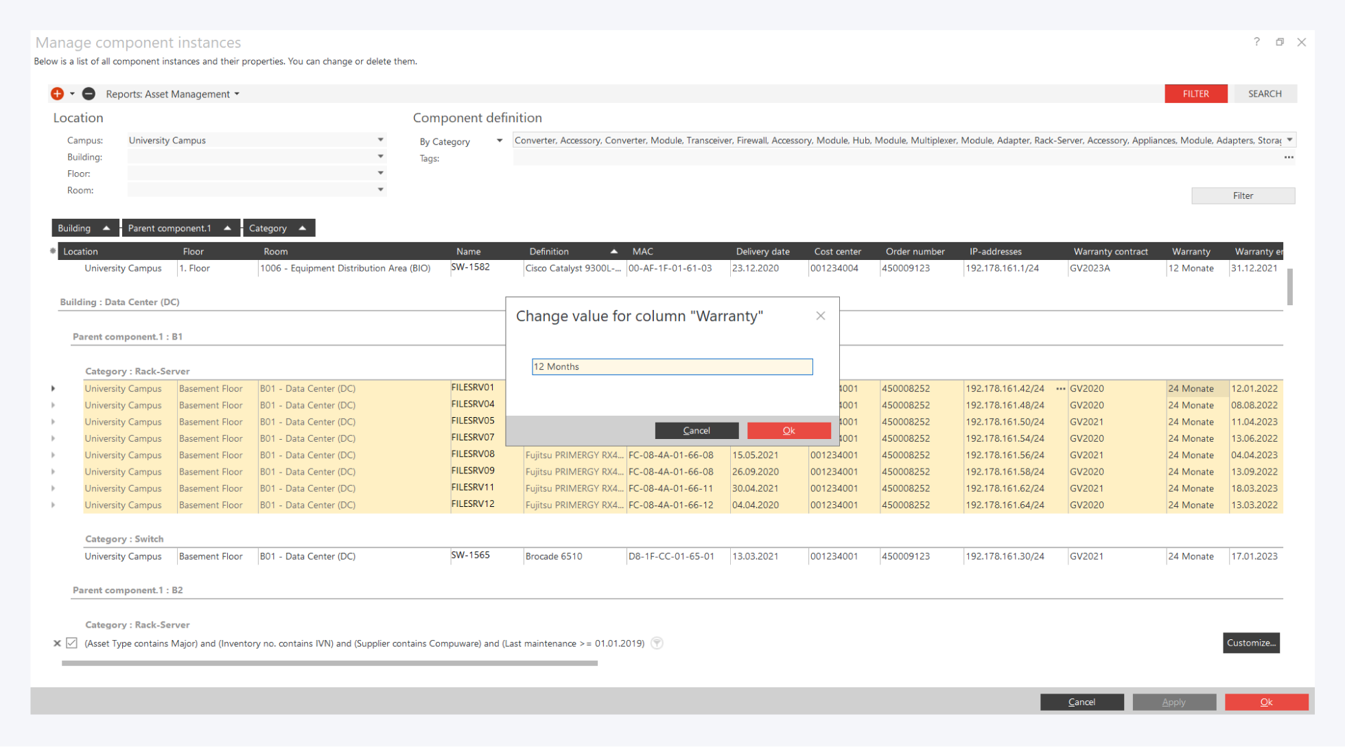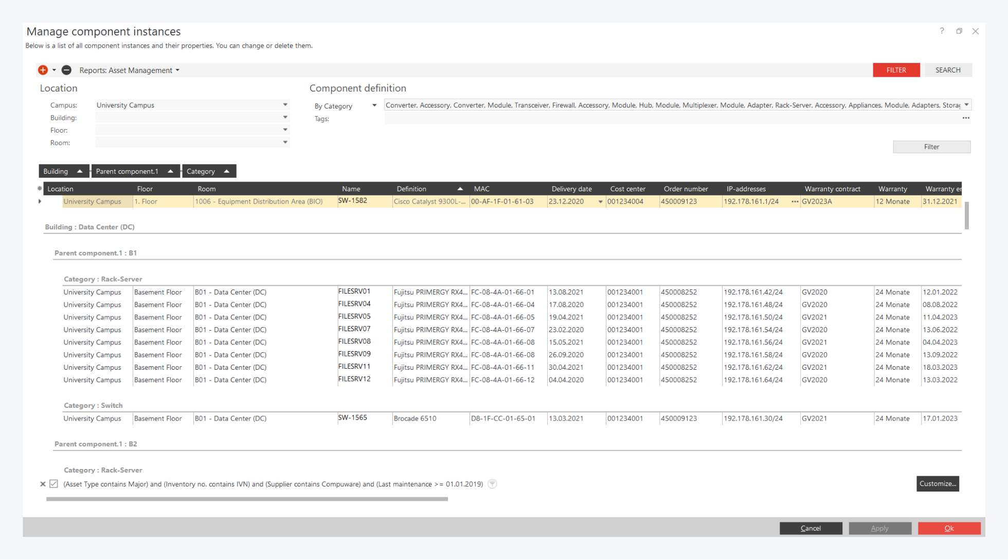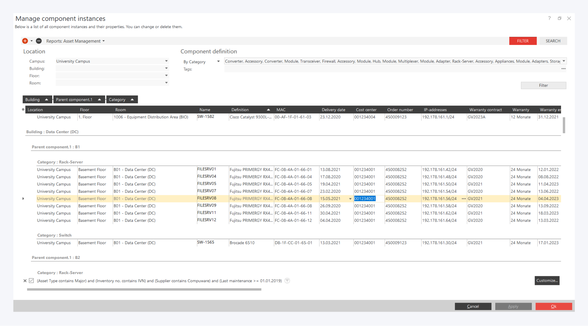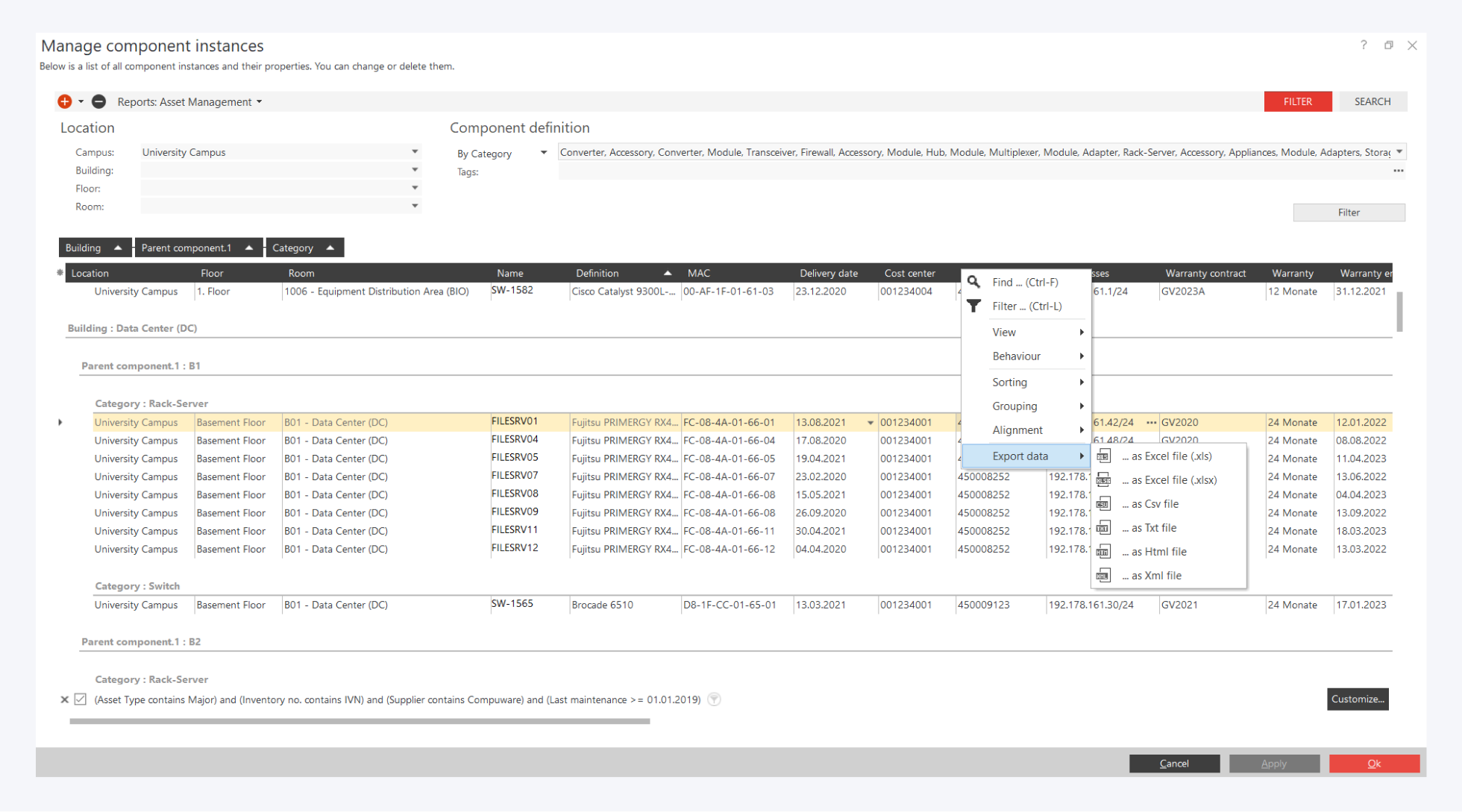 You want to open and edit your active assets like switches or servers in an asset management system? You will find the navigation bar on the left side of the screen. Here you can access the predefined reports. Now open the sample report "asset management" and filter e.g. by operating system or maintenance contract.