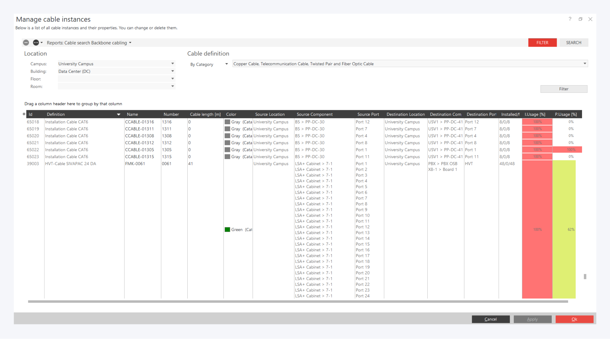 The report has been configured so that you can search for primary cabling connections between the data center and the target building Biology, restricting to cable length and utilization.