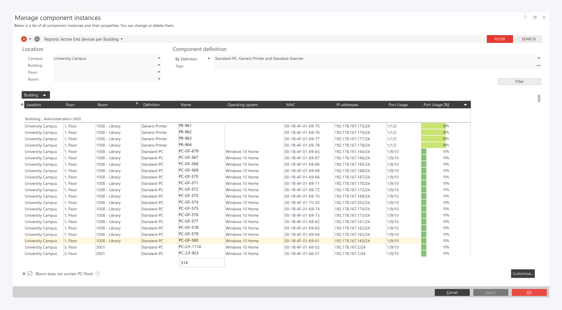 Of course, you can run the queries per room or restricted to a specific device type. Simply narrow the requirements down for location, component(s) and port type and start the query.