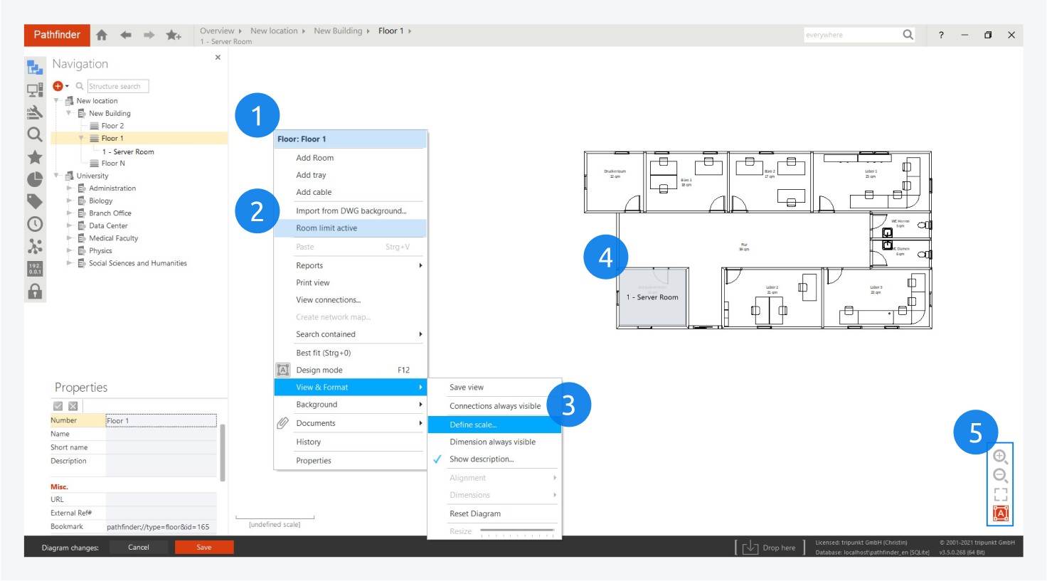 Right click on the map screen area and turn on the room limit active (2) and define the scale (3) of measurements to create components in the rooms fit to scale. To define the perimeters of a room (4) Click on the Design mode (5) or press F12 and resize the room area limit.