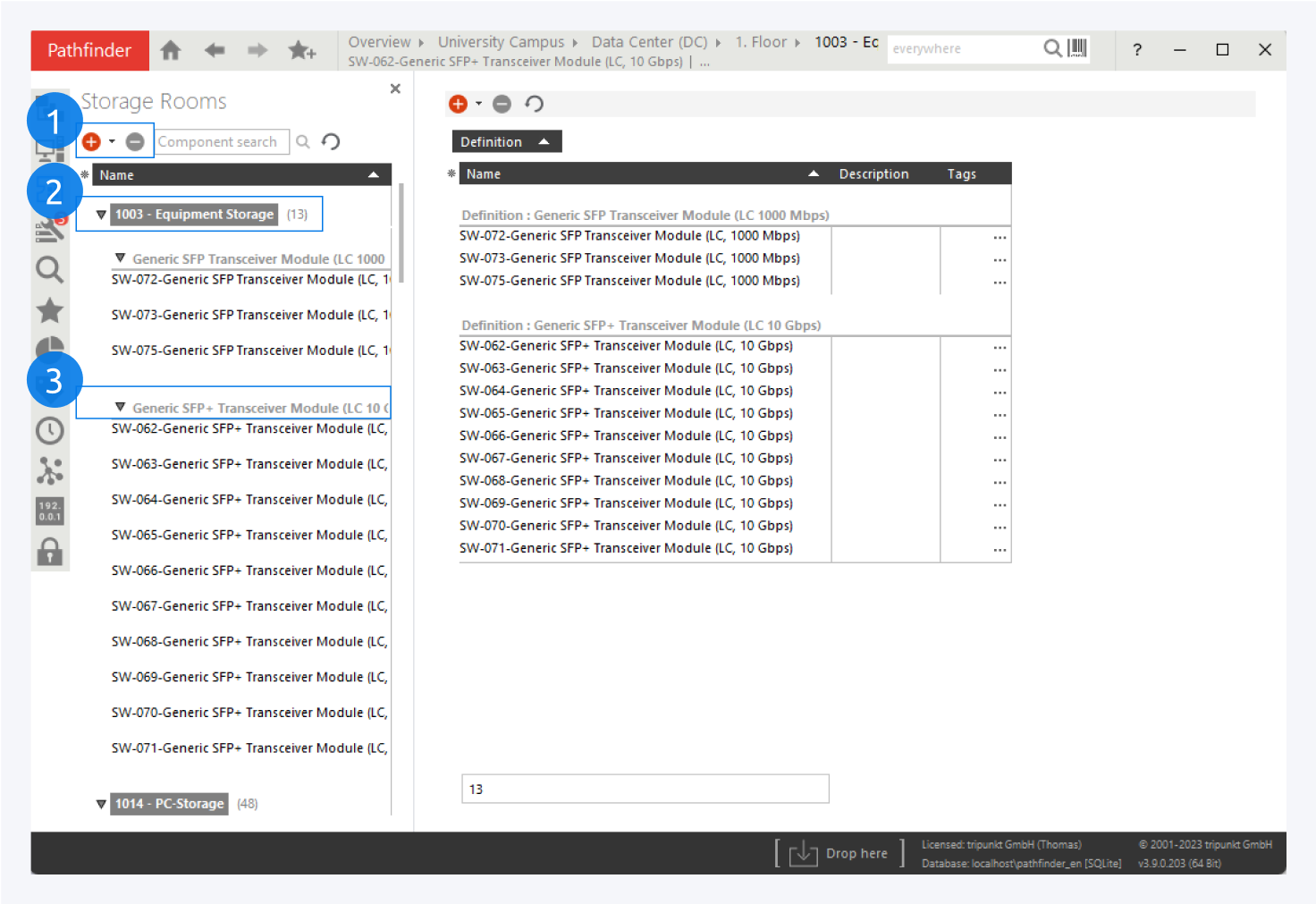 In the sidebar tab you can add new components to any storage room (1). Below there is a list of all stored components grouped by room (2) and component definition (3).
