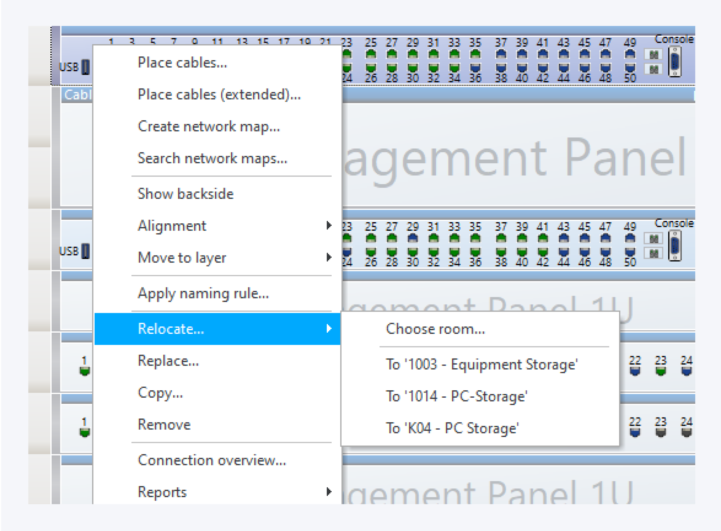 In order to move a component to a storage room select Relocate… and then the desired room in the context menu.