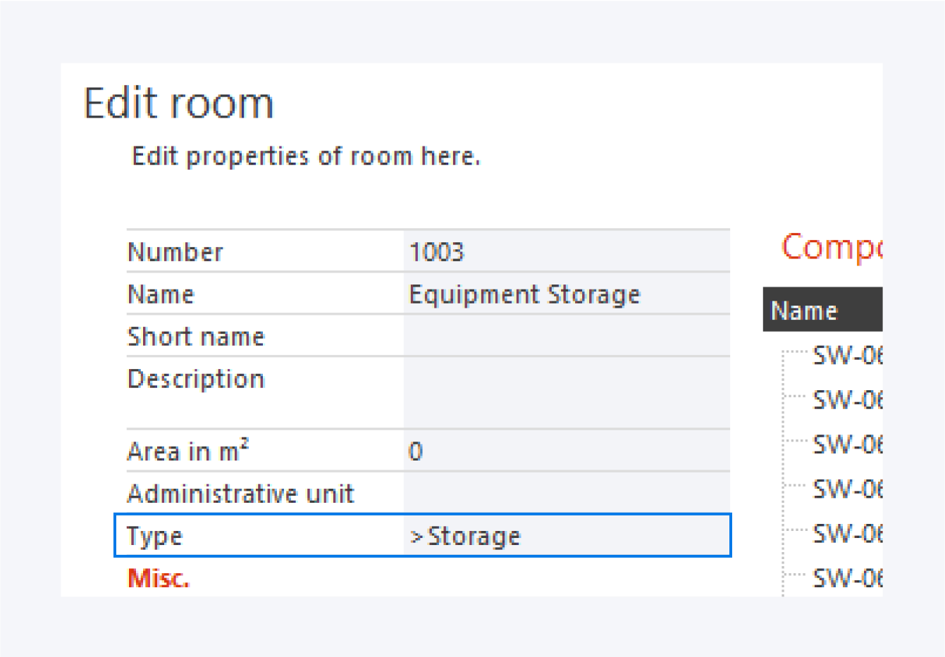 In order to turn a room into a storage unit you need to change its type to >Storage in the room properties. Now the room view will be replaced with a list of components and the room will be added to the storage rooms sidebar tab.