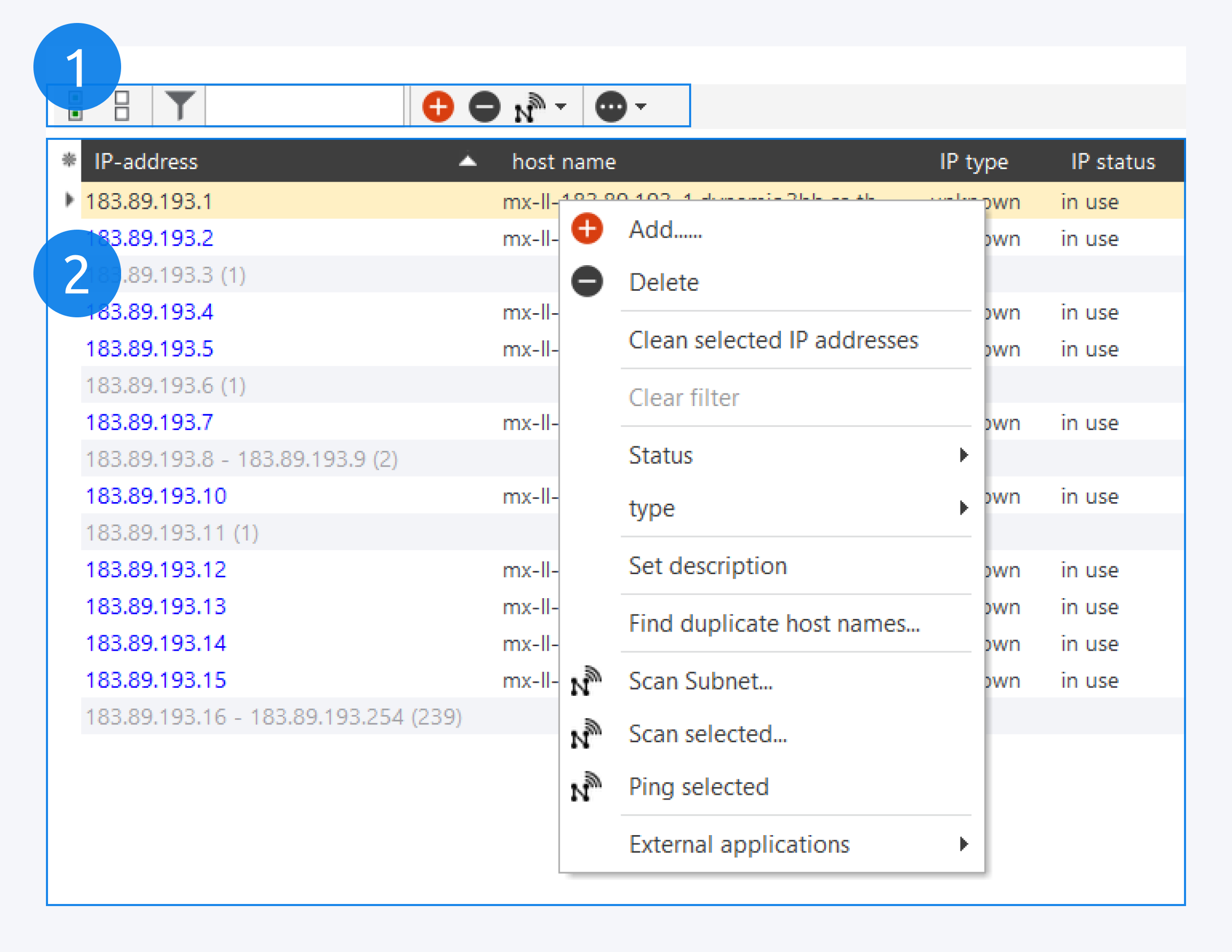 You can filter, add and delete IP addresses, scan for IP addresses and find more options here (1).