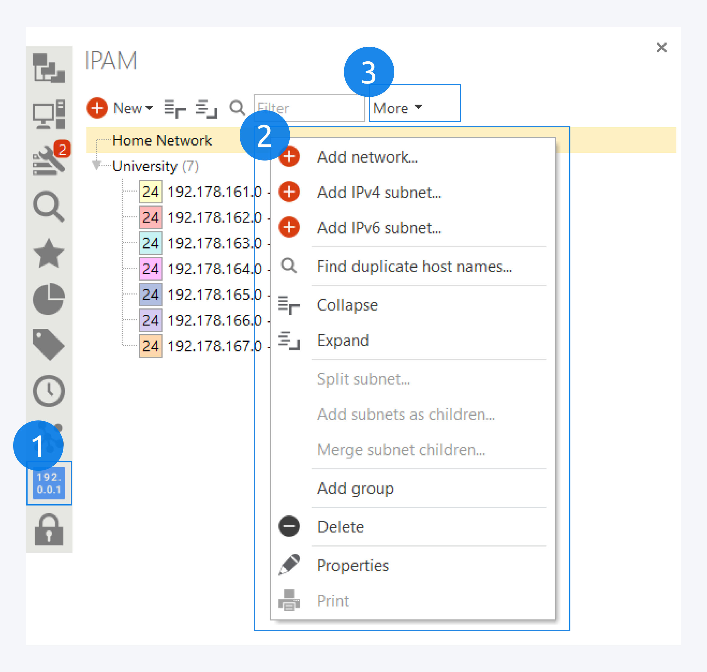 The manage subnets and IP addresses option opens the IPAM sidebar tab (1). From here you can add a new network using the + icon. You can also add a network from the context menu (2).