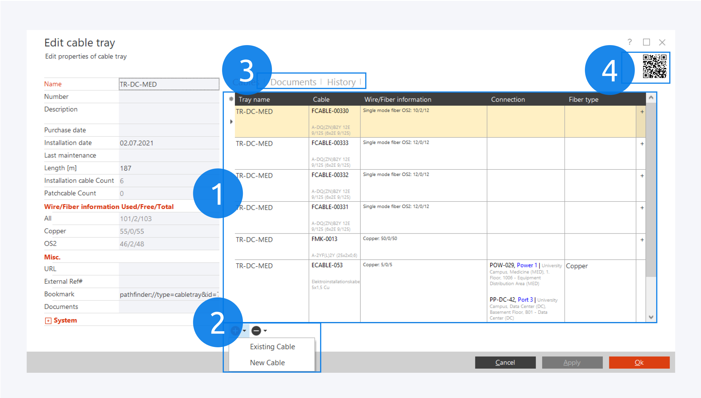 There is a list of all included cables on the right in the Cables tab (1). You can add new or existing cables to the tray here (2).