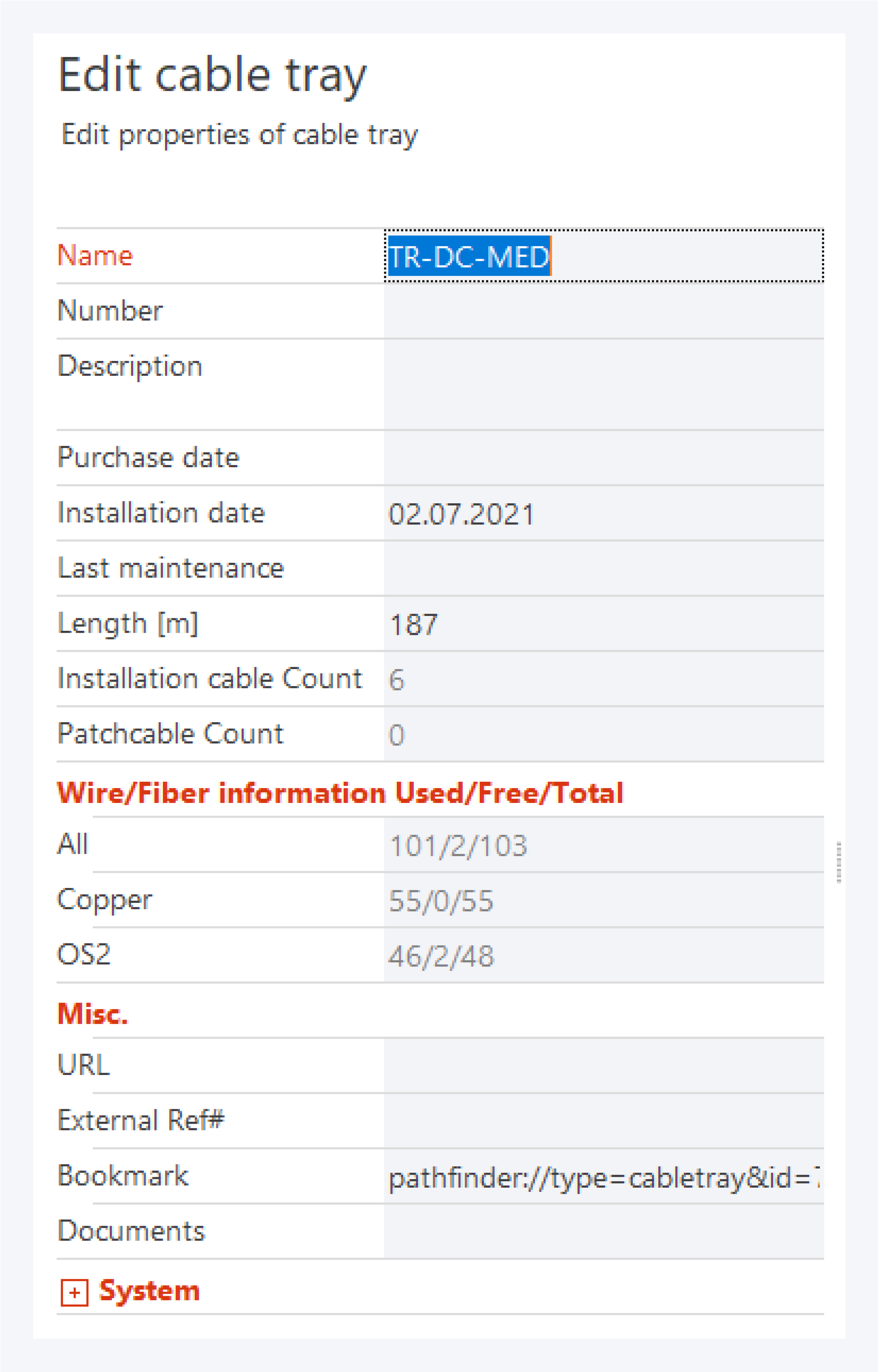 | Name: Assign a name to the cable tray. Number: Assign a number to the cable tray. Description: Write a description for the tray. Purchase date: Purchase date of the tray. Installation date: Installation date of the tray. Last maintenance: Last maintenance date of the tray. Length [m]: Length of the tray. Installation cable count: Number of installation cables placed in the tray. Patch cable count: Number of patch cables in the tray. Wire/Fiber information: A summary of used and free wires/fibers among the included cables. URL: Assign a web link to the instance. External ref.: Assign an external reference to the instance. Bookmark: A direct link to the tray. Documents: Attached files. For more detail see below.
