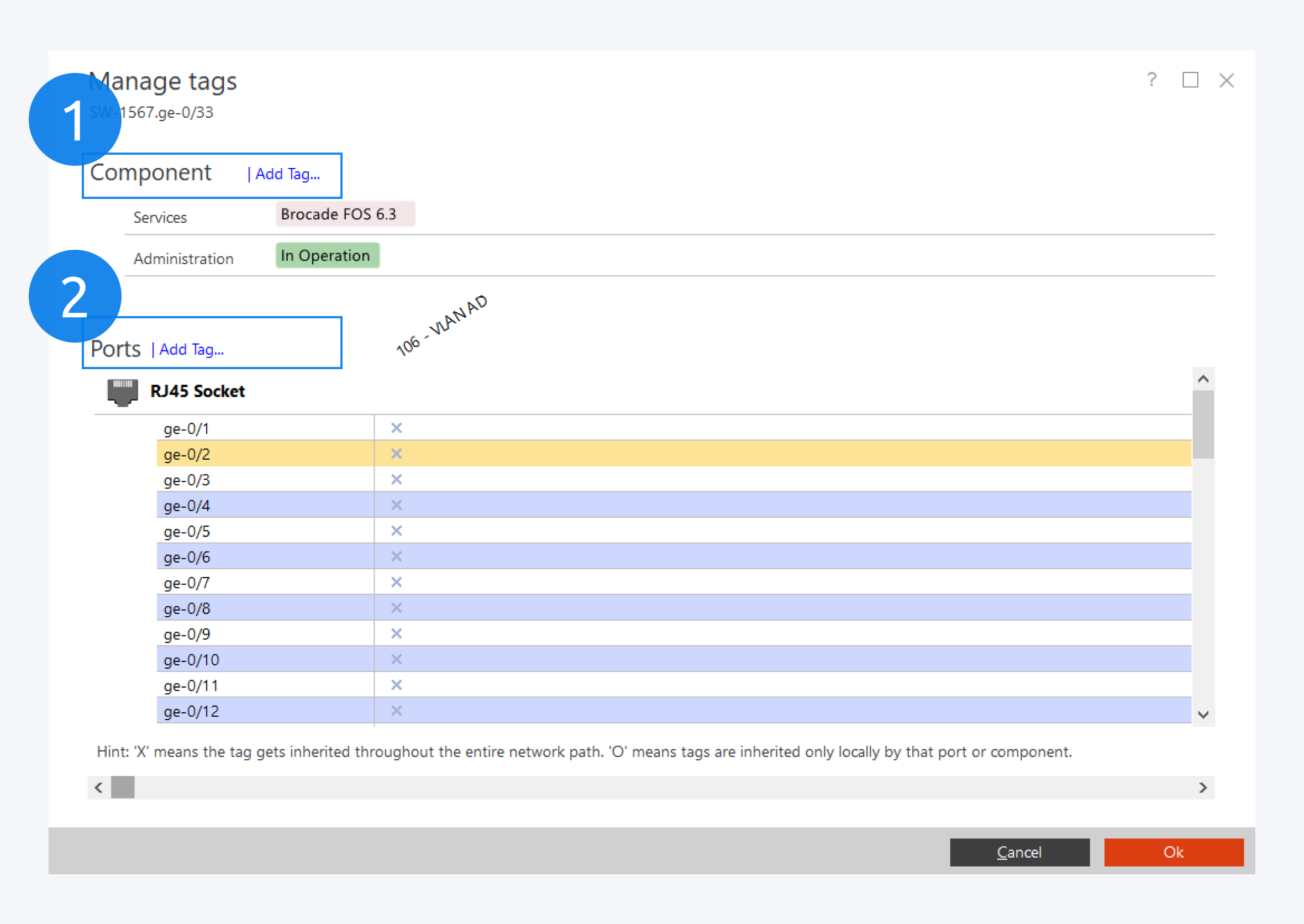 To assign a VLAN to a port, select the ports and select Add Tag (2) to open the Add Tags dialog window.