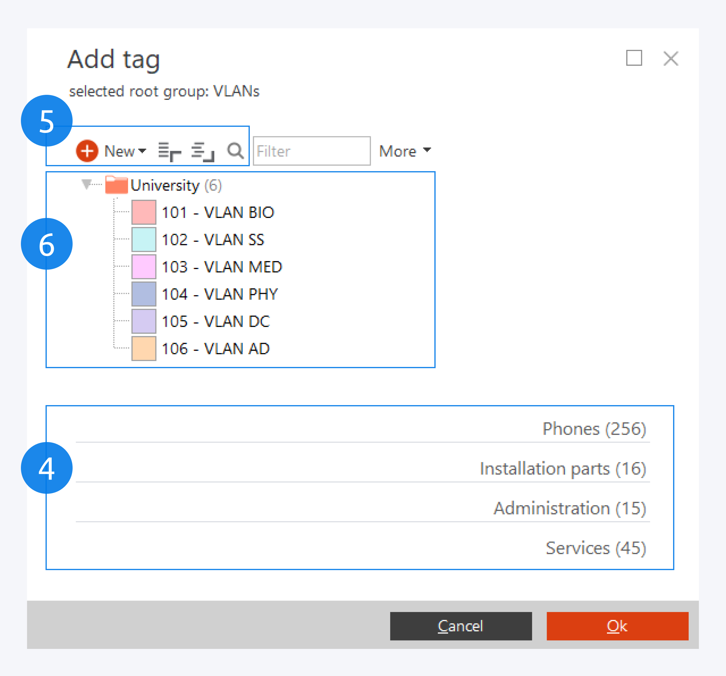 In the add tag dialog window, click on VLAN from the root groups (4) and select the VLAN you want to assign to the component or port.