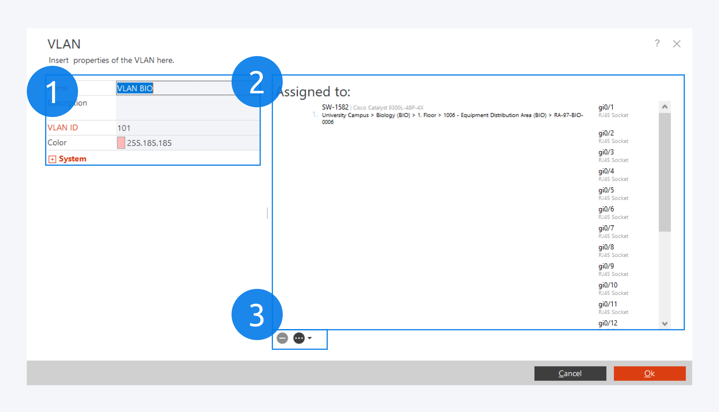 The objects the VLAN is already assigned to are displayed here (2).