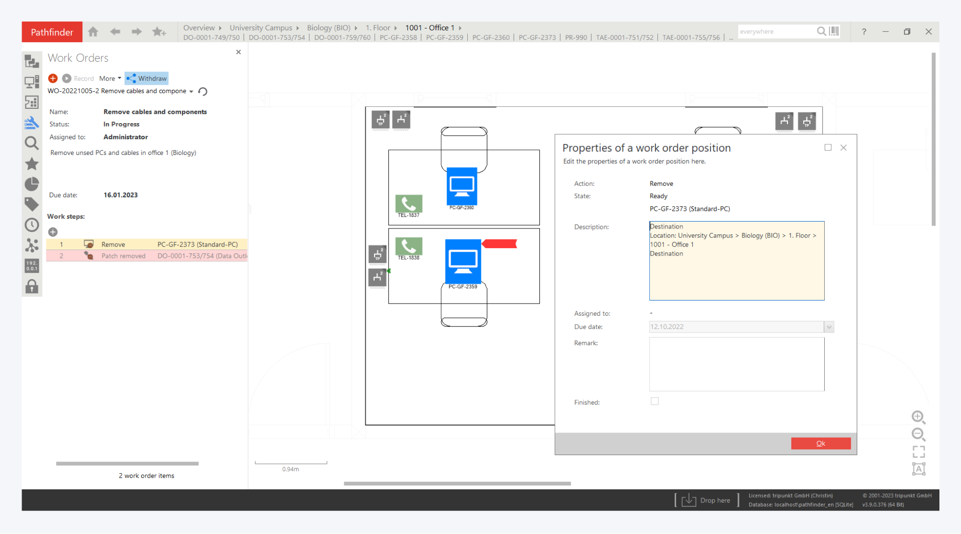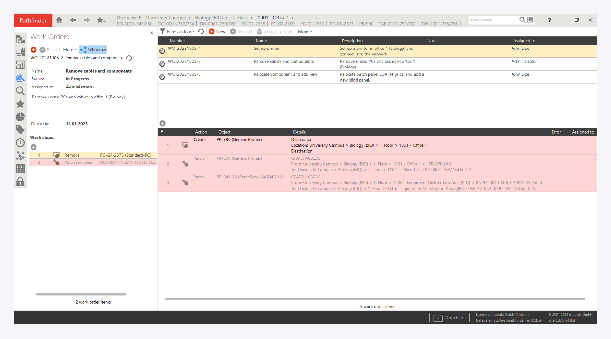The sample site University holds three work orders, which can be viewed in detail. To do so, open the work orders in the sidebar. For the demo database, the first work item we will be looking at is the removal of a fiber optic module.